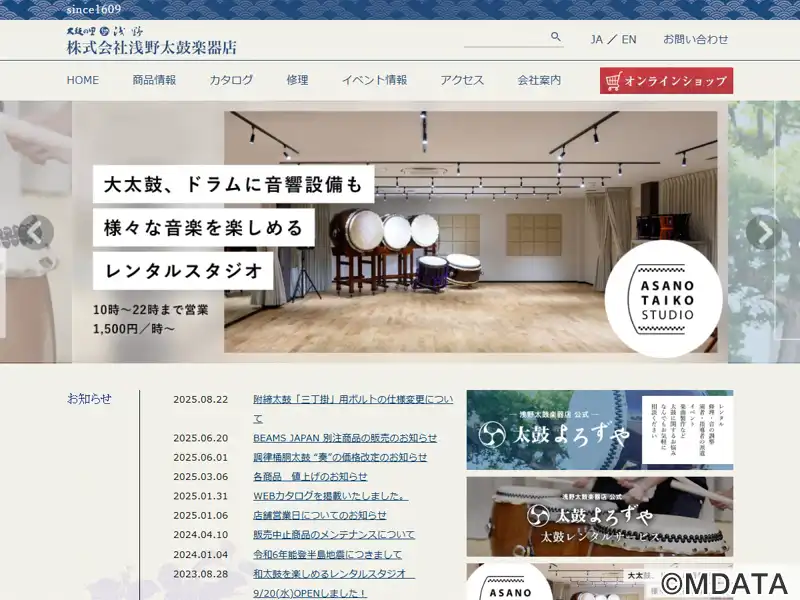 石川県白山市にある、1609年創業の和太鼓専門店。オーダーに合わせて一つずつ丁寧に手作業によって生産される。ショールームには、和太鼓をはじめとする関連商品や祭礼用具、笛、DVD、CD、関連書籍などが豊富に揃い、修理も行う。同店は、製造・販売の「浅野太鼓楽器店」、和太鼓文化の研究を行う「財団法人浅野太鼓文化研究所」、太鼓のレンタル業務を行う「浅野太鼓祭司株式会社」の3つの事業と、和太鼓教室を開講している。