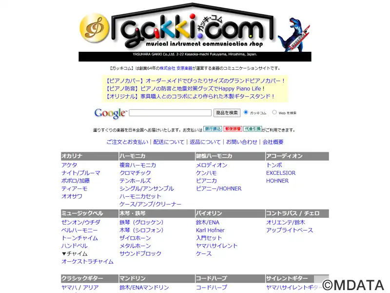福山本通商店街にある1961年創業の楽器専門店。とおり町ストリートガーデンの中程に位置し、楽器・楽譜販売、音響機器レンタル、ピアノ調律・楽器修理などを行う。2階には、レッスンやセミナー、練習などに利用できるレンタルスペースが2部屋あり、セミコンピアノとアップライトピアノを完備。レッスンスタジオとしてピアノ、ギター、ハーモニカ、オカリナ等の音楽教室を行っている。オンラインショップ「ガッキコム」運営。