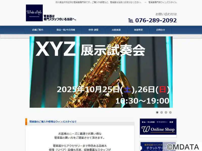 石川県津幡町に位置する管楽器専門店。フルート、オーボエ、クラリネット、サクソフォン、トランペット、ホルン、トロンボーン、ユーフォニアムなど、国内外の多様なブランドの管楽器や打楽器など、豊富な中古管楽器の在庫を取り揃えている。初心者からプロフェッショナルまでのニーズに応え、高品質なリペアサービスと充実したアフターサポートを提供。音楽教室ではフルート、クラリネット、サックス、カホンなどのレッスンを開講。