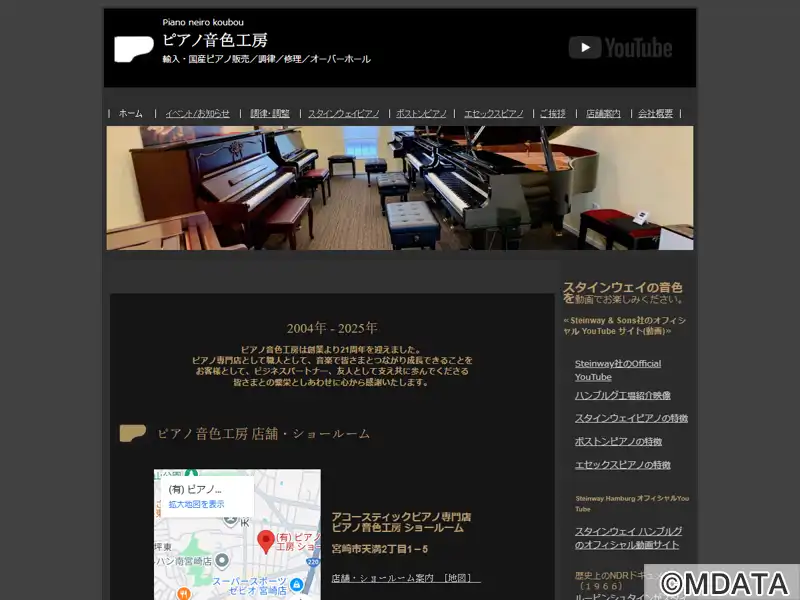 宮崎市を拠点とするアコースティックピアノ専門の工房。2004年の創業以来、「地方でも最高の技術を」を理念に掲げ、スタインウェイ、ボストン、エセックスなどの高品質な輸入ピアノや国産ピアノを厳選して展示・販売している。2014年にはショールームを開設し、見学や試弾は予約制で静かな環境の中じっくりとピアノを選ぶことができる。経験豊富な技術者が調律・修理・オーバーホールまで一貫して対応。信頼の体制を揃える。