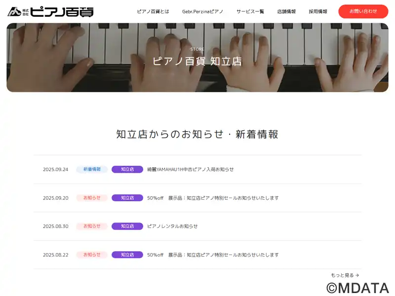 1972年創業の全国チェーンピアノ専門店「ピアノ百貨」の知立店。特定のメーカーにこだわらず、新品・中古、国内外のブランドピアノを一堂に取り揃えている。一台一台、専門技術者によりしっかり査定された商品のみ展示し、ピアノの品質を管理している。また、調律、修理、運送・引越し、保管などアフターメンテナンス全般に対応。初めてピアノをはじめられる方から、もう一度再開される方まで、多くの方のピアノライフをサポートする。