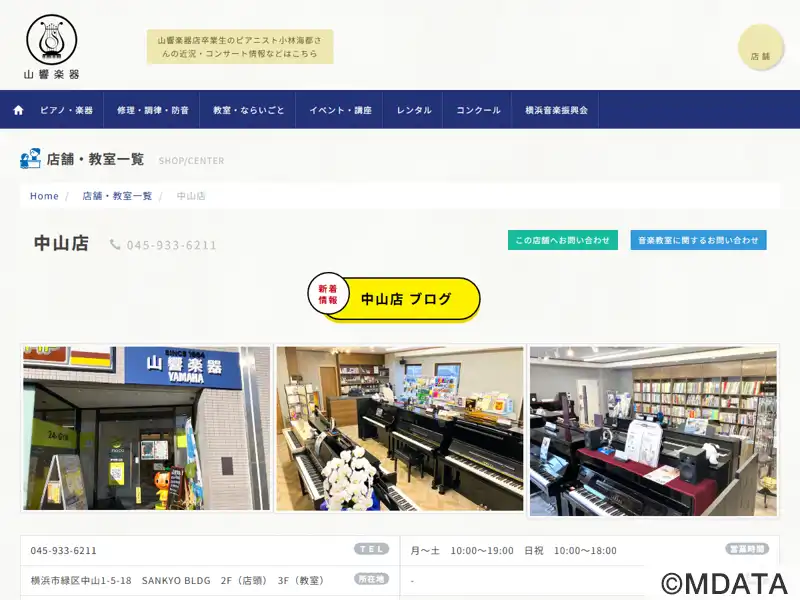 横浜市緑区にある、ヤマハ特約店の山響楽器店中山店。4階建ての施設で、1階は楽譜や小物の販売、鍵盤楽器の展示、防音室での楽器体験も可能。2階のAKIRAホール(87名収容)では定期イベント開催。音楽の楽しさを共有する。3階から4階は音楽&英語教室になっており、お子様から大人までニーズに合わせた様々なレッスンが展開されている。バンド練習にも対応するスタジオも完備する。様々な音楽活動をサポートしている。
