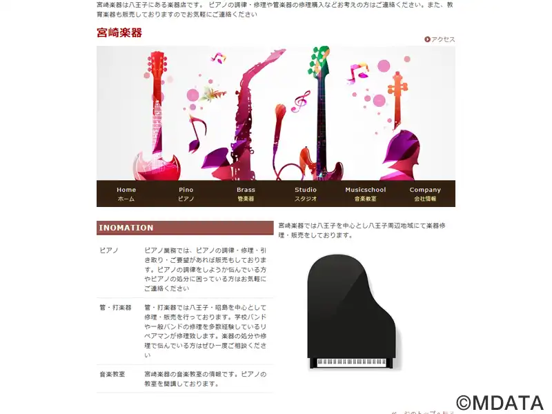 八王子本郷にある総合楽器店で、ピアノ、管楽器、打楽器など学校向けの楽器販売を中心に行う。店頭ではギター弦、管楽器の備品、ピアノのメンテナンス商品なども取り扱う。また、リペアマンによる管楽器の修理やメンテナンス、ピアノの調律も対応。スタジオではピアノの合わせや連弾練習が可能で、初心者から上級者まで対応するピアノ教室も開講している。音楽に関する一貫したサービスを提供し、地域の音楽文化に深く根ざしている。