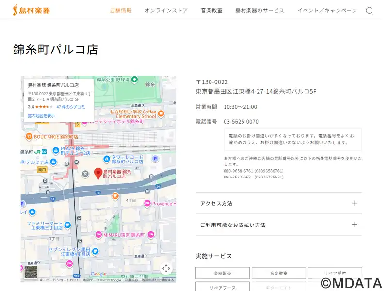 東京・JR錦糸町駅南口から徒歩1分の錦糸町パルコ5階に2019年オープンした総合楽器店。練習スタジオと音楽教室を併設し、店内には電子ピアノ、ギター、ベース、管楽器、アクセサリーなどを揃える。また、クラシック音楽に特化したコーナーや、防音室の展示も行い。音楽教ピアノ、ギター、エレキベース、ウクレレ、ドラムなどの講座を開講。初心者からプロ志望まで対応する。中古楽器の取り扱いや買取サービスも提供している。