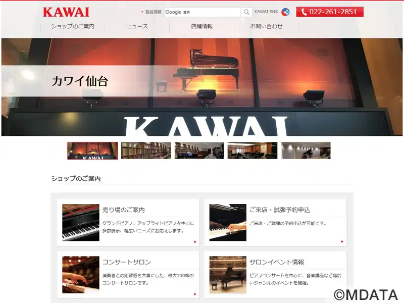 仙台市一番町四丁目商店街アーケードにあるカワイピアノ展示場。広々とした空間で、Shigeru Kawaiの特別仕様品、グランドピアノGXシリーズ、人気のアップライトピアノや電子ピアノを豊富に展示販売する。15,000冊の楽譜を取り揃え、1Fには防音室も完備。音楽教室も開講し、子どもから大人まで楽しめます。4Fには最大100席のコンサートサロン「Verde」があり、ミニコンサートや音楽講座が開催される。