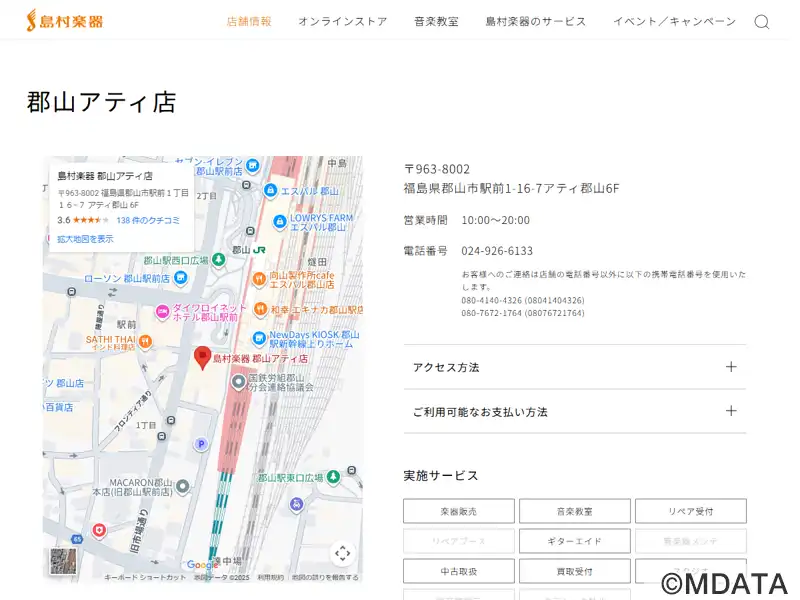 郡山駅西口駅前の複合商業施設「アティ郡山」6Fに2001年オープンした「音楽をプレイする楽しさ」を提案する総合楽器店。ギターやドラム、管弦楽器、電子ピアノ、デジタル機器などジャンル多彩に品揃え。各種アイテムの選び方もスタッフに気軽に相談できる。併設する練習スタジオは20畳と12畳の2部屋あり、Aスタジオではサークルやイベントも行われる。音楽教室のレッスン受講の際は提携駐車場1時間分の駐車券を進呈。