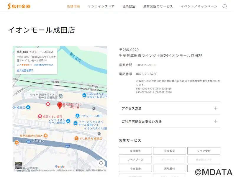 2000年にオープンした大型ショッピングセンター「イオンモール成田」2Fにある総合楽器店。ギター、ピアノ、管弦楽器、楽譜など幅広い品揃え。管楽器リペアスタッフが常駐しており、店頭のリペアブースで修理・調整に対応。試奏から選定、購入後のメンテナンスまでサポートする。音楽教室では約20科目の多彩なレッスンを開講し、2部屋のレンタルスタジオを完備している。京成成田駅前とイオンを結ぶ直行路線バスで約10分。