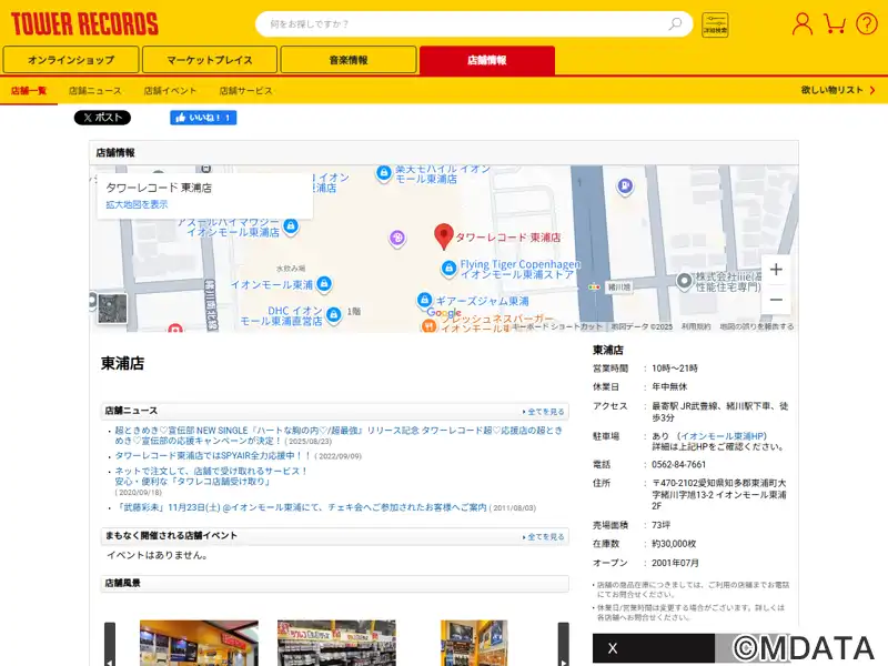 愛知県知多郡の緒川駅から徒歩3分のイオンモール東浦内に、2001年オープンしたタワレコ東浦店。2019年に増床棟2Fへリニューアルし、広さ約73坪の店内には約30,000枚の在庫を揃える。J-POP、K-POP、アニメ、洋楽など幅広いジャンルを取り揃え、地域出身アーティストとのコラボも行っている。ネット注文を店舗で受け取れる、店舗受け取りサービスや、インストアライブ、特典会などのイベントも定期開催。