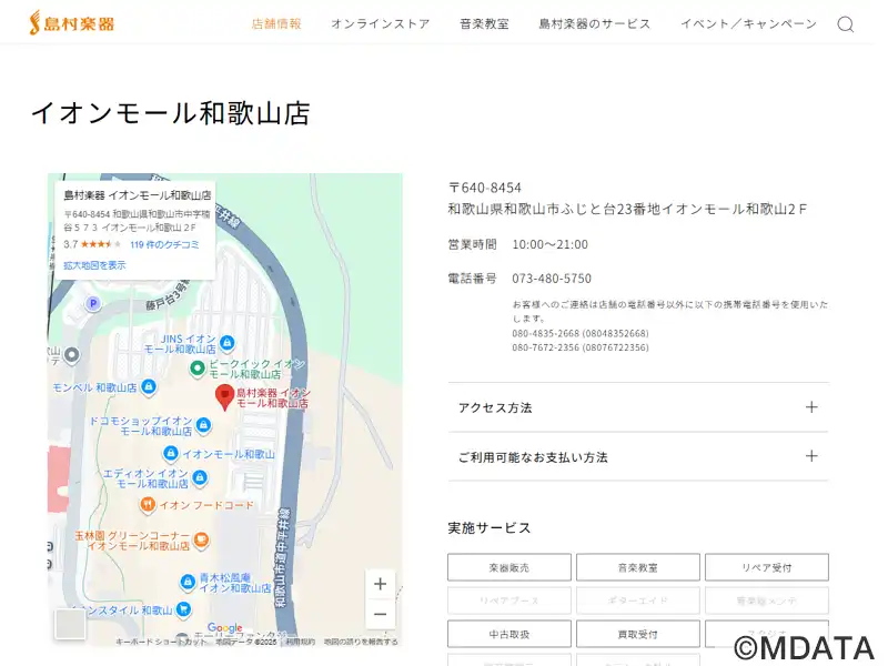 南海電鉄「和歌山大学前駅」直結のイオンモール和歌山2Fに、2014年3月にオープンした総合楽器店。広々としたフロアに、ギターやベース、電子ドラム、シンセサイザーなどのLM楽器から管弦楽器、電子ピアノ、楽譜、各種アクセサリーなどが幅広く取り揃え、展示販売する。子供から大人までの多彩なコースの音楽教室と、充実した機材を備える練習スタジオを併設。ソロ、バンド、弾き語りのインストアライブを定期開催している。