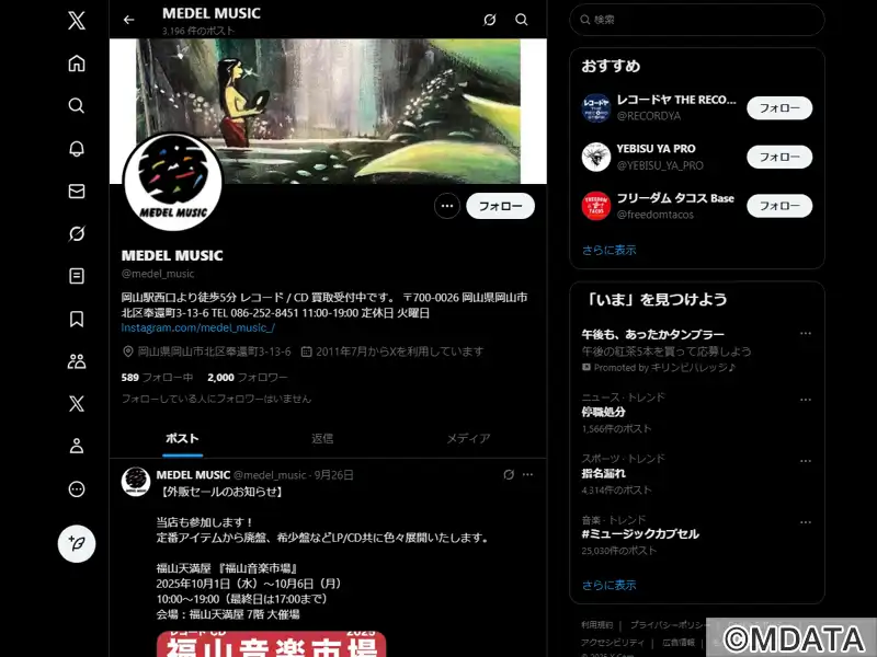 旧グリーンハウス岡山店。2022年4月より屋号をMEDEL MUSICに改称。老舗レコードショップ・グリーンハウスの岡山支店として開業。2021年2月28日より問屋町から奉還町商店街に店舗移転オープン。ヒップホップ、R&B、レゲエ、クラブジャズ、ハウスなどクラブ系ミュージックからロック、Jインディー、ポップなど幅広く、中古&新譜CD・アナログともに充実。全国ゲストショップのアナログフェアも開催。