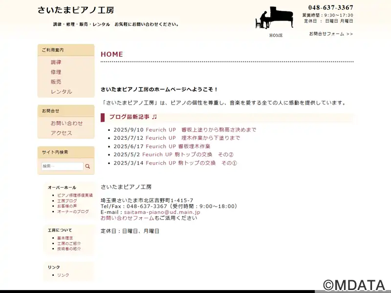 さいたま市吉野町にあるピアノ工房。2006年に開設。ヨーロッパのピアノメーカー工房で培った技術を基に、国産から輸入品、アンティークまで、さまざまなピアノの修復・再生に取り組んでいる。ピアニストや調律師と連携しながら、一台一台の個性を尊重した調律、修理、オーバーホールを実施。美しい音色と自然なタッチを追求し、弾き手の想いに寄り添う作業を通じて、ピアノ本来の魅力を引き出す。中古ピアノの販売も手がける。