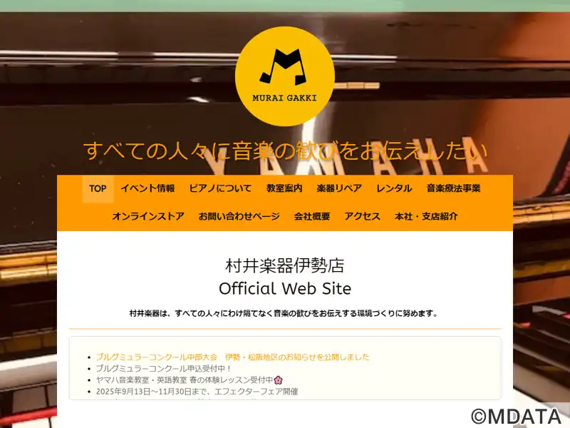 三重県伊勢市に1928年に創業した総合楽器店。ピアノを中心に、鍵盤楽器、管・弦楽器、LM楽器、アクセサリーを展示販売。教則本や楽譜の在庫は常時8千冊以上。グランドピアノ常設ホールや練習スタジオのレンタル、ヤマハ音楽教室やオリジナルレッスンも開講。学会認定音楽療法士とのコラボレーションで、高齢者や障がい者などの社会的弱者の方々にまで音楽を普及し、成熟した社会を目指す「ミュージックノーマリゼーション」を掲げる。