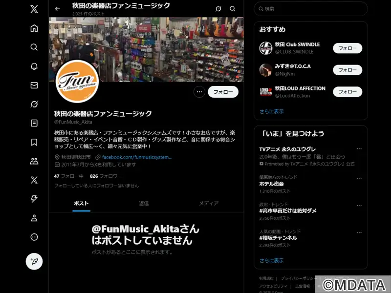 秋田県のJR秋田駅近くで2008年にオープンした楽器店。ギターやベース、ドラムを中心に、弦楽器や打楽器、ハーモニカ、シンセサイザー、音響機器など幅広く取り扱う。自社でのリペア体制を活かし、修理や調整、カスタマイズにも柔軟に対応。また、オリジナルグッズやケーブル製作、楽器・機材のレンタル、イベント音響や照明オペレートにも対応。長年の経験を活かしてライブイベントの主催や音楽文化の普及にも力を入れている。