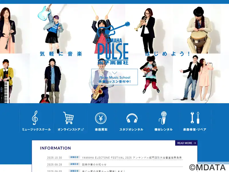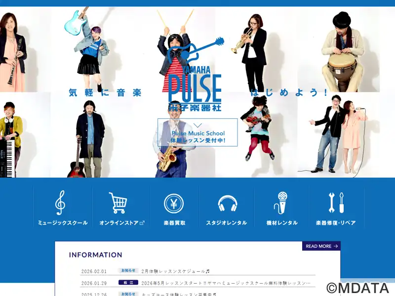音楽を通じた豊かなライフスタイルを提供する、ヤマハパルス米子楽器社米子店。オンラインストアを中心とした楽器販売、LM楽器の買い取り・下取り、大型楽器(ピアノなど)の出張査定も可能。音楽教室では年齢やレベル、経験、ライフスタイルに合わせた18コースを開講しており、初心者も歓迎している。さらに、バンド練習のためのスタジオレンタル、ピアノ、アンプ、PA機材などのレンタル、楽器の修理サービスも提供している。