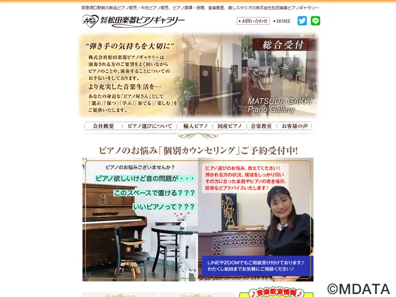 尼崎市の阪急塚口駅前にあるピアノ専門店。新品・中古ピアノの販売、調律・修理を行う。ピアノ選びにおいては、予約制の「ピアノ工房」で、直接ピアノの音色やタッチを体験して、ピアノ選びをサポートする。音楽教室「ミュージックサロン」では、ピアノ・フルート・ギター・ソルフェージュ科などの個人レッスンを開講。音楽の楽しさを伝えている。また、ミニコンサートが可能なサロンスペースや練習スタジオの貸し出しも行っている。