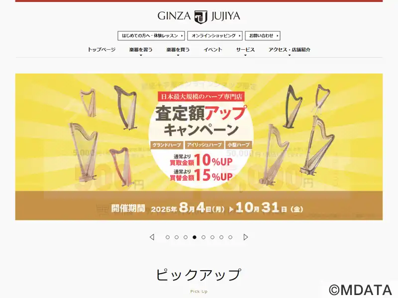 日本初の西洋楽器店として明治7年に創業したハープ・フルート専門店。イタリアのサルヴィハープ、アメリカのライオン&ヒーリー、日本の青山ハープなど、世界3大ハープメーカーの楽器を取り扱い、購入からメンテナンスまで一貫したサポートを提供する。さらに、ハープのレンタルやハープ奏者や講師の紹介など、ハープに関するあらゆるニーズに応える。銀座サロンでは、初心者から上級者を対象とした、ハープ教室を運営している。