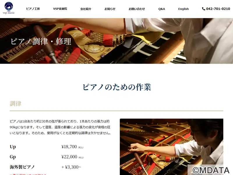 相模原市のVSP音楽企画が運営するピアノ工房。「お客様の様々なご要望に誠実にお応えする」を理念に、ピアノ調律・整音などのメンテナンス、ピアノ修理、消音機取付、クリーニング・ピアノ運送も承ります。ショールームではヨーロッパ輸入ピアノ・国産ピアノを常時展示。信頼のおけるメーカー品、万全に調整された中古リニューアルピアノ等あらゆるご予算に応じて各種取り揃えています。VSP音楽院を運営。