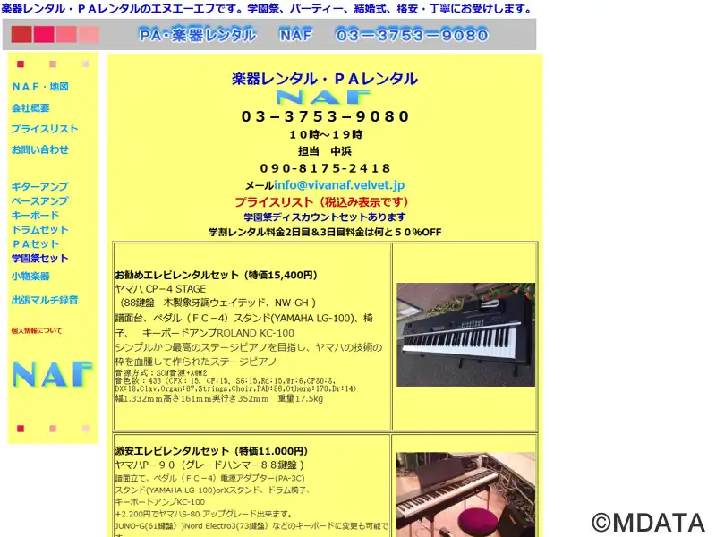 大田区池上にある有限会社エヌエーエフが運営する音響事業を行う会社。楽器・PAレンタル、PA出張サービスなどを提供。デジタル楽器を中心に、エレピ・アンプ・ドラム・バンドセットやDJセット、音響機器はマイク1本からレンタル可能。結婚式・パーティー・学園祭など、開催されるイベントに合わせて必要な楽器、機器、オペレーターの手配プランを提案する。また、CD制作、出張録音、レコーディングなどの制作業務も行う。
