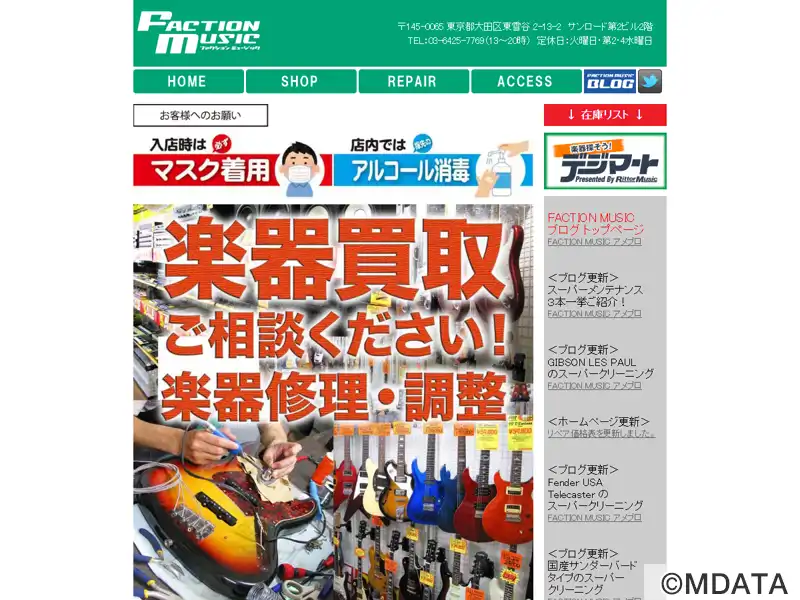 大田区東雪谷の石川台駅から徒歩3分にある、ギター&ベースを中心に扱う楽器店。ギターやベース、エフェクター、レコーディング機材、新品アクセサリーなど、商品を豊富に取り揃えている。中古機材も、マイク、アウトボード、レコーディング機器まで用意。リペア・メンテナンスも専門スタッフが対応し、カンタンな調整なら即日お渡し可能。初心者からプロミュージシャンまで、アフターケアや弾き心地の調整などの要望に対応する。