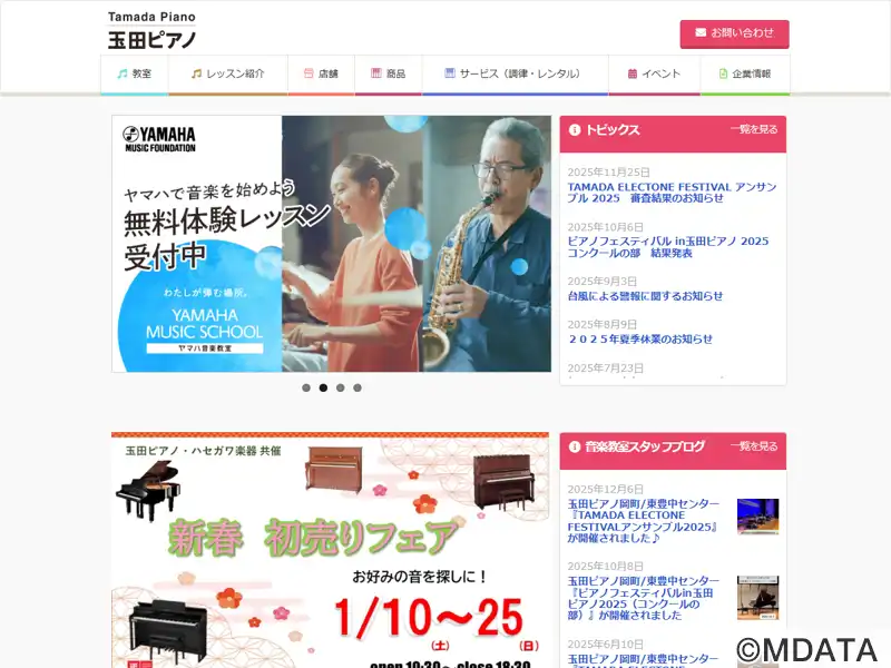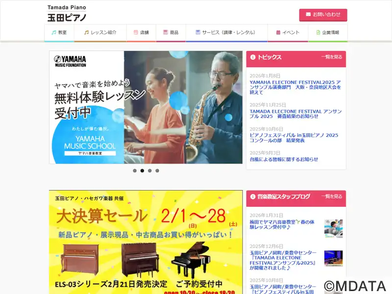 大阪市淀川区を拠点とする玉田ピアノのピアノショールーム。国内外のさまざまなメーカーによるグランドピアノやアップライト、エレクトーンなどを常時多数展示。ベテランのピアノ職人が在籍し、購入時のアドバイスや購入後の調律・修理・クリーニングなどのメンテナンスにも対応。ショールーム内の防音室では、子どもから大人までを対象とした個別レッスンを開講しており、初心者から経験者までレベルや目的に合わせた指導を行う。
