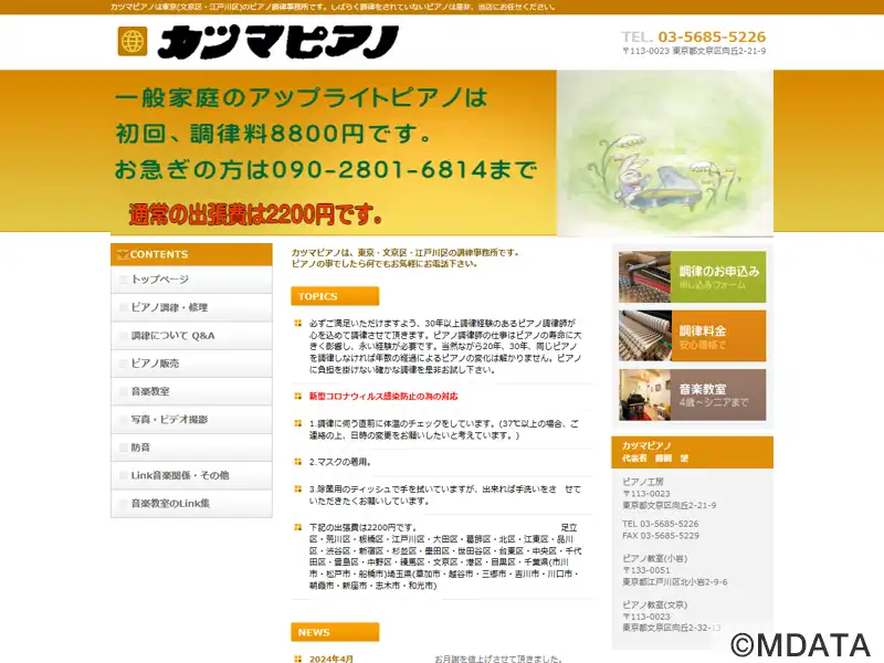 東京都文京区と江戸川区に拠点をもつ、ピアノ専門工房。30年以上の実績を持つ調律師が、ピアノの調律から修理、オーバーホールまで、ニーズに合わせたサービスを提供。長年の経験に基づく確かな技術で、ピアノの寿命を延ばし、音楽のある生活をサポートする。また、新品・中古ピアノの販売、買い取り、処分や、防音設備の導入、発表会などの撮影や録音などの業務も行う。3歳から、各レベルに合わせたピアノ教室も運営している。