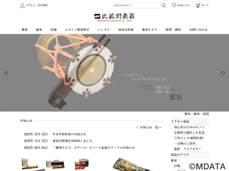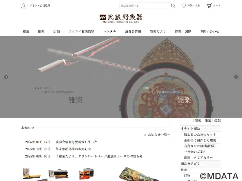 東京・北区にある雅楽と能楽の伝統を守り続ける専門店。竹製や特殊樹脂製の楽器をはじめ、笙、篳篥、龍笛などの販売、調整、修理を行い、音色、音律、耐久性に優れた製品を提供している。職人が常駐する修理工房も完備。さらに、ムサシノ雅楽教室を通じて、初心者から経験者まで雅楽の魅力を広く伝えている。教室では基礎から丁寧に指導し、楽器のレンタルサービスも利用できます。雅楽や能楽の貴重な学習と体験の場を提供している。