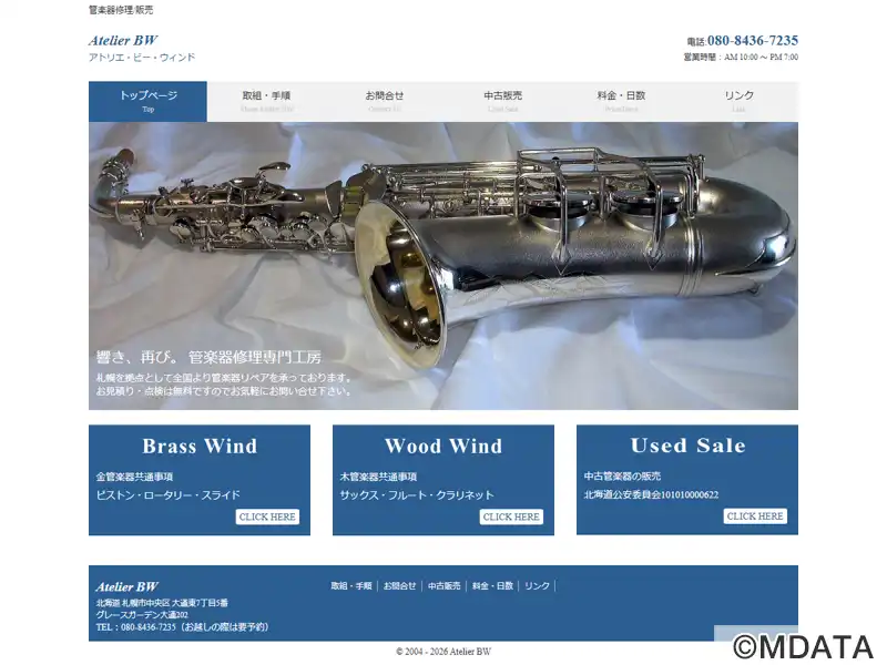 札幌を拠点に運営する管楽器リペア専門工房。金管から木管楽器まで、手作業による精密な修理・カスタマイズにより、楽器本来の響きを取り戻すサービスを提供している。アマチュアからプロまで、個々の楽器に合わせた最適な修理・調整プランを提案する。予約制による対応で、継続的なメンテナンスにも役立つカルテを作成し、作業に取り組んでいる。オーバーホール済みのヴィンテージサックスやメタルクラリネットの販売も行っている。