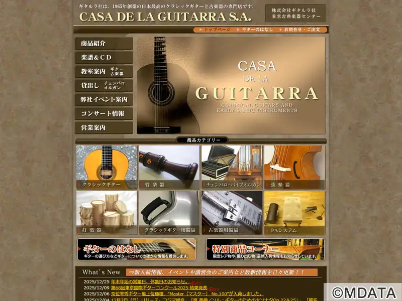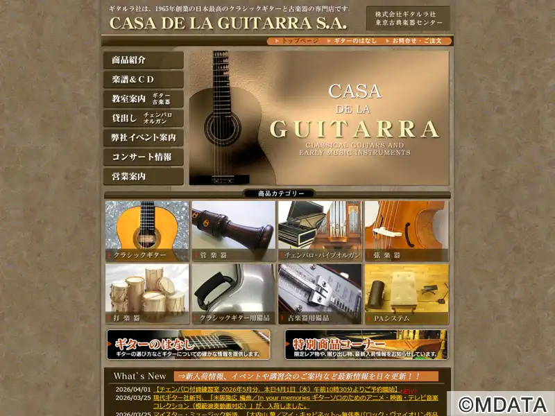 1965年に創業したクラシックギターと古楽器の専門店。入門者や初心者向けのギター、中級者以上におすすめの国産・輸入ギターなど厳選提供。古楽器も管楽器、鍵盤楽器、弦楽器、打楽器など豊富に取り揃え、PAシステム、楽譜・CDの販売、修理サービス、楽器のレンタルも行う。また、2段チェンバロ、1段チェンバロ、ポジティフオルガンを常設した練習スタジオの貸し出しや、クラシックギターから古楽器までの様々なレッスンも行っている。