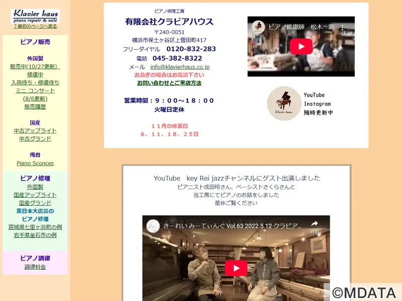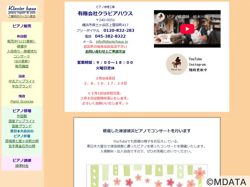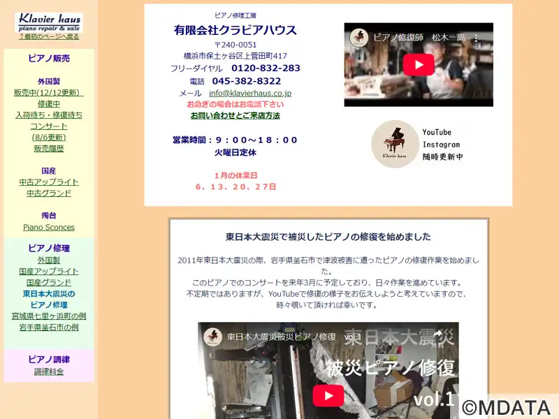 横浜市保土ヶ谷区のピアノ修理工房。外国製から国産まで、グランドピアノやアップライトピアノの中古販売、買取、修理、調律、内外装のクリーニングなど幅広いサービスを提供。特に1900年代初頭のヨーロッパ製ビンテージピアノの修復・調整には定評があり、現地買い付けの輸入品を丁寧に整備し、工房内で試弾することも可能。代表の松木一高氏の経験が修理や調律技術に活かされ、「311復興ピアノ」にも関わった実績も持つ。
