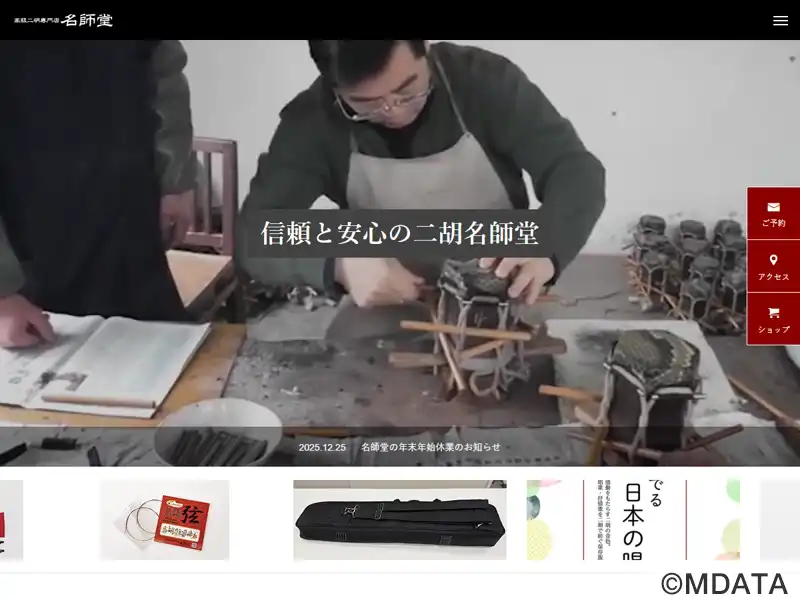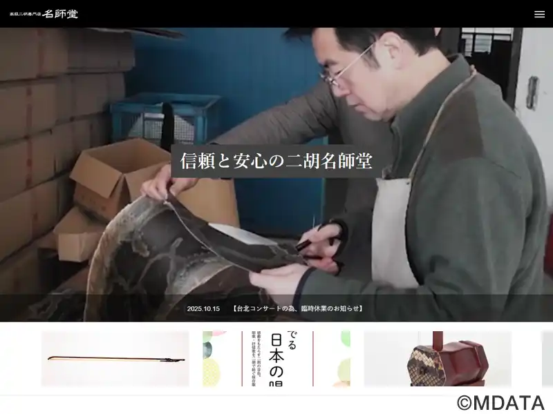 大阪・西心斎橋にある二胡専門店「名師堂」の大阪店。店内は中国の伝統家具で彩られ、落ち着いた雰囲気で、修理や調整も対応。専門知識が豊富なスタッフが二胡についての相談に応じる。上質な二胡のみを厳選し、音色や演奏感を自身で確認してから購入できるのが特徴で、遠方からでも試聴ページを通じて高級二胡を選べる。本体だけでなく、弓や弦、駒、千斤、二胡音程表示装置などのアクセサリーも豊富に取り扱う。東京・神戸店あり。