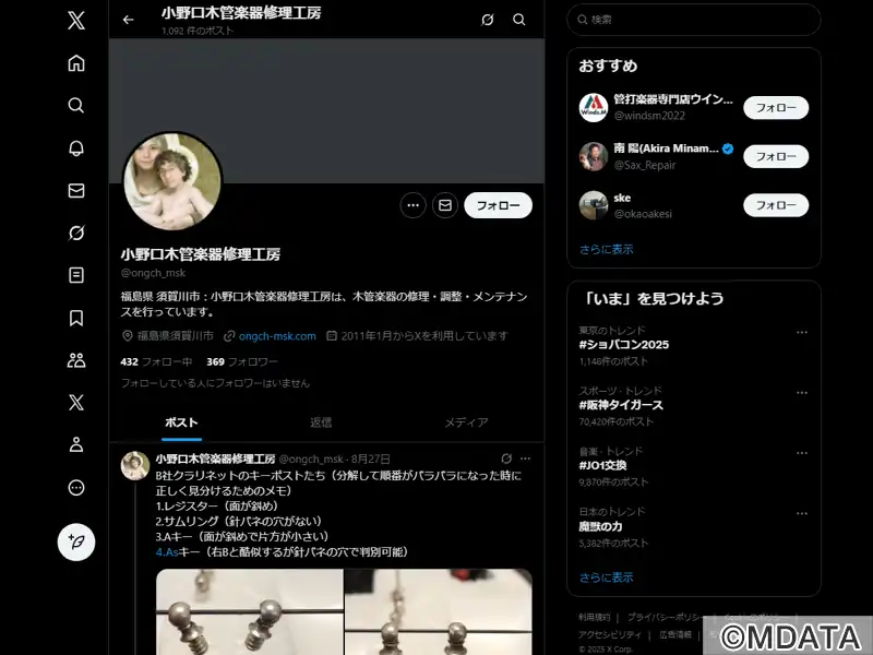 福島県須賀川市にある、様々な種類の木管楽器の修理、調整、メンテナンスを行う管楽器修理工房。フルート・ピッコロ、クラリネット、ハーモニークラリネット、オーボエ・イングリッシュホルン、ファゴット、サクソフォンなどに対応可能。また、修理見積もりは無料で行っています。工房での音出しも可能で。店主の小野口伸也氏は東京コンセルヴァトアール尚美卒、クラリネット奏者として演奏活動や、吹奏楽の指導なども行っている。
