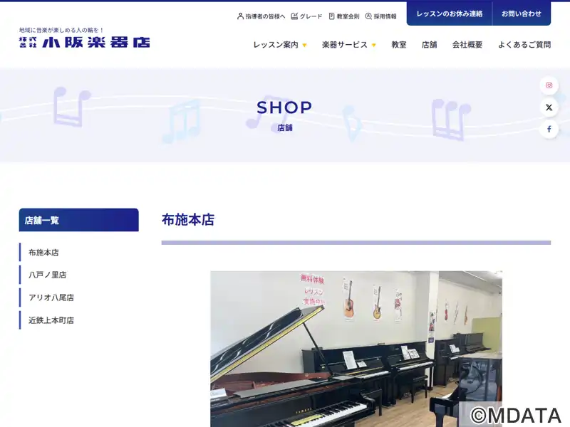 東大阪布施にある、1962年創業の小阪楽器店の本店店舗。ヤマハの正規特約店として、ピアノ、エレクトーン、電子ピアノなどの鍵盤楽器や、LM楽器のギターや電子ドラム、管楽器、楽譜など、厳選されたラインナップを取り揃えている。また、ピアノ調律や管楽器のリペア、防音室の設置などにも対応。音楽教室「布施センター」を併設し、子供向けの「ヤマハ音楽教室」、大人向けの「ヤマハミュージックレッスン」を開講している。