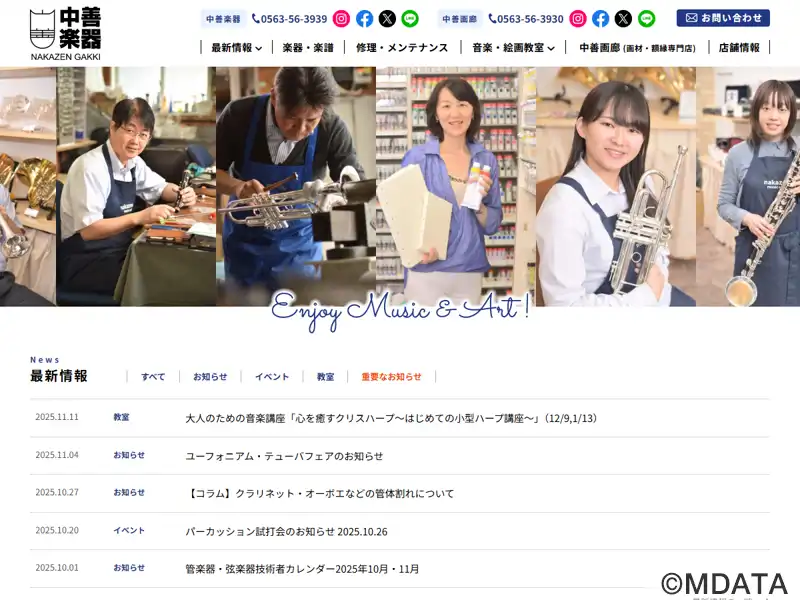 管楽器・吹奏楽ライフを応援する西尾市の管楽器専門店。楽器本体からマウスピース・リード、小物アクセサリーの販売、自社工房による修理・アフターメンテナンス、ミュージックスクールまでトータルにサポート。オンラインショップもあり、楽器は完全調整済みで発送。西尾本店のほか、千種に楽器リペア&練習スタジオ「ブレーメン」をオープン。画材・額縁円門店「中善画廊」運営。