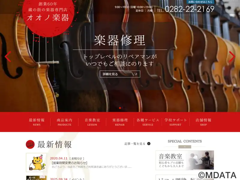 栃木市にある、1956年創業の弦楽器・管楽器専門店。国内外のメーカーによる楽器や付属品、楽譜の販売をはじめ、ピアノの調律・修理、音楽教室の運営などを通じて、地域に根ざした音楽活動を支援。和楽器や教育用楽器も取り扱っており、年齢や用途を問わず、幅広いニーズに対応。2階には、最大60名を収容できるホールやレッスン室があり、発表会や練習の場として利用できる。演奏会、楽器フェアなどのイベントも定期的に開催。