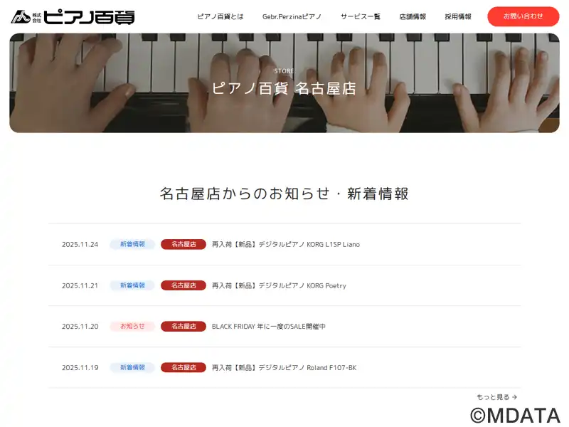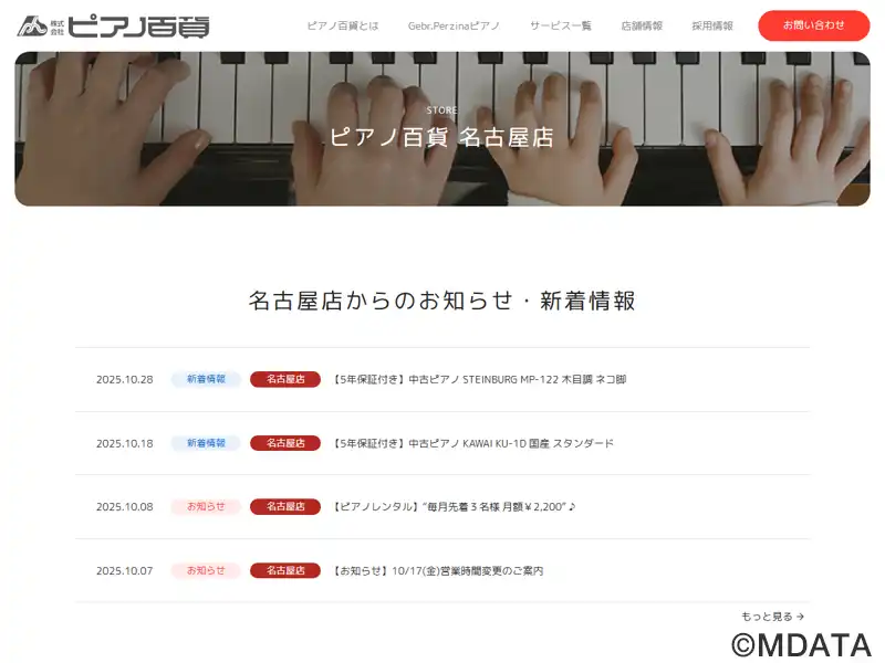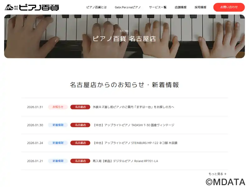 愛知県名古屋市に位置する、創業50年以上の歴史を誇るピアノ専門店「ピアノ百貨」の主要拠点の一つ。練習用から専門家向けまで常時約30台のピアノが展示され、複数メーカーの製品を実際に試弾できる環境が整っている。新品・中古ピアノの販売に加え、レンタルやメンテナンス、調律、消音ユニットの取り付けなど幅広いサービスを提供。全国にアフターサービス体制を持ち、運送や保管にも対応している。また、レッスン教室も併設。