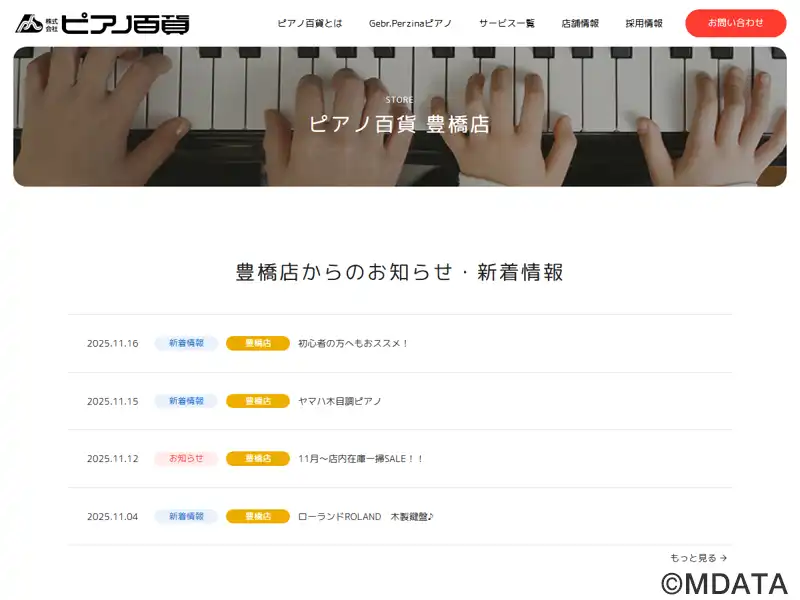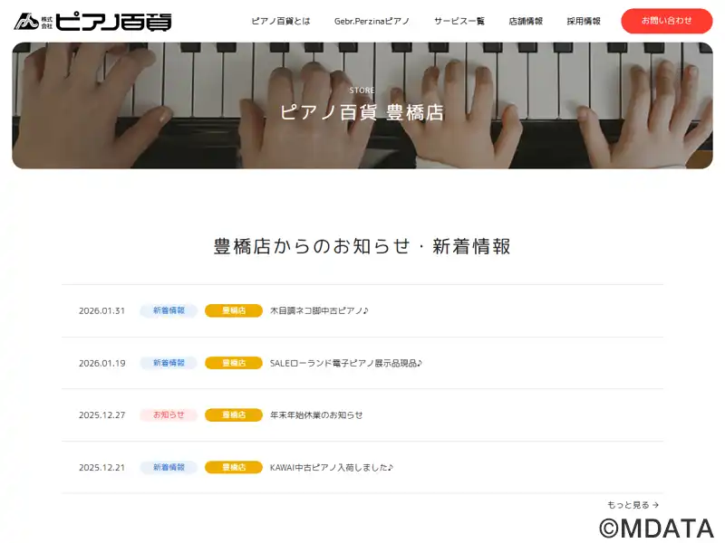 愛知県豊橋市にある、1972年創業の全国チェーンのピアノ専門店「ピアノ百貨」の豊橋店。当店では、品質管理に特化し、専門の調律師や技術者による徹底した品質管理とアフターサービスを提供。新品・中古ピアノ、サイレントピアノ、電子ピアノの販売から調律、移動、修理まで、幅広いサービスを取り扱う。直接メーカーから仕入れることで低価格を実現。自社工場・工房での入念な修理、調整を行う。店内にはキッズスペースもある。