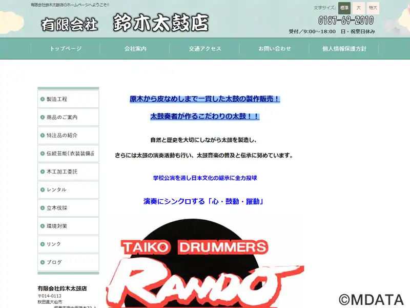 1983年創業の秋田県大仙市にある和太鼓専門店。自然と歴史を大切にしながら太鼓を製造している。伝統芸能用から創作太鼓まで、製作は原木の加工から皮なめし加工まで一貫して行われる。また、木材を加工した際に出る木クズを廃棄せず、堆肥として再加工し自然に帰すなど環境にも配慮している。太鼓の演奏活動から作曲、演技指導、太鼓講習会、講師派遣、太鼓イベント企画など、地域に根差した太鼓に関するあらゆるニーズに応えている。