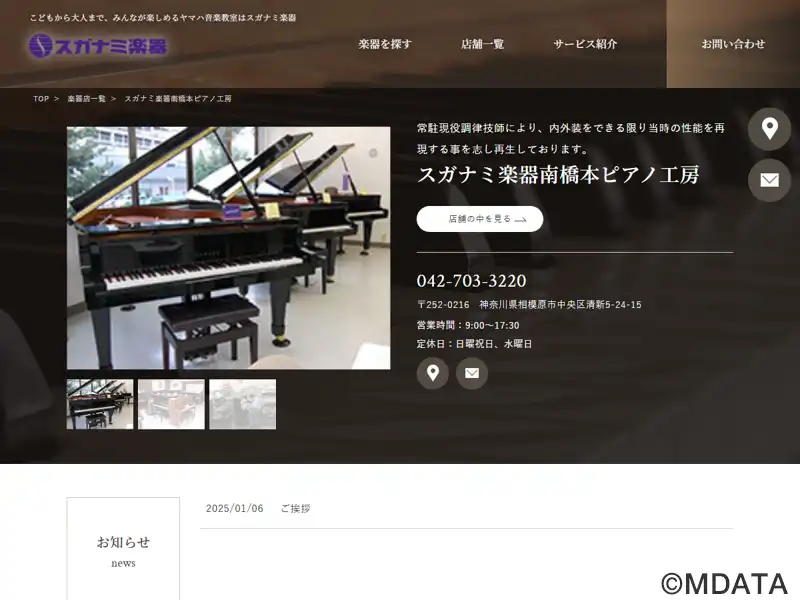 相模原市にあるスガナミ楽器の南橋本店。ピアノ工房と中古ピアノの専門店として、常時40台近くのピアノを展示販売する。購入後も専門スタッフとピアノ調律師などの技術陣が、きめ細やかにサポートする。ピアノ工房では、常駐の調律技師によって下取りや買取りされたピアノを整備し、中古ピアノとして販売する。また、利用中のピアノの修理や整備、オーバーホールも行う。作業は楽器本来の性能を再現することを心がけた再生を目指す。