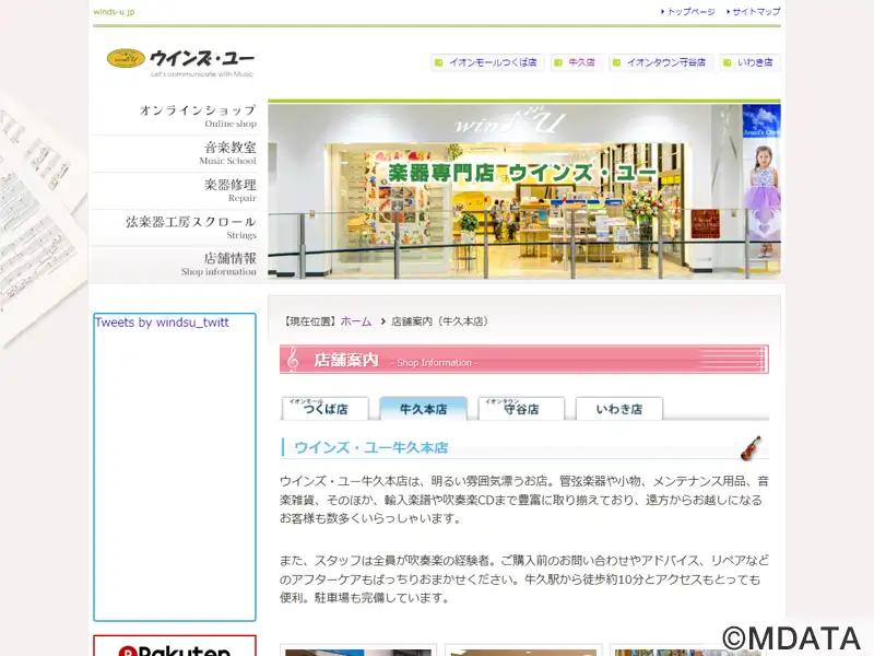 茨城県牛久市にある楽器専門店。豊富な管楽器、弦楽器、音楽雑貨、輸入楽譜や吹奏楽CDを取り揃えている。吹奏楽経験者のスタッフが、購入相談からアフターケアまでサポートする。修理工房では、全メーカーの楽器修理・調整に対応している。音楽教室では、経験豊富なインストラクターによる個人レッスンを、広々としたレッスン室で様々なコースを開講している。「あなたの街の楽器屋さん」として、多様なサービスを提供している。