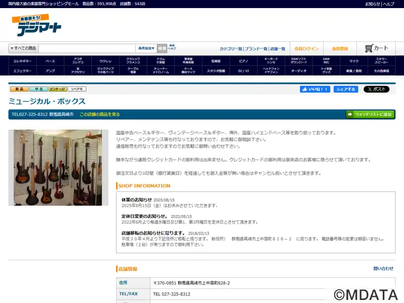 群馬県高崎市を拠点とする楽器専門店。1993年に連雀町で開業、2018年に上中居町へ移転リニューアルした。ヴィンテージギターや珍しい中古楽器、特にベースギターの品揃えに特化し、国内外から選りすぐりの品を提供している。販売の他、下取り、リペア、メンテナンスサービスも手掛けている。オンライン販売も充実し、商品の詳細情報から自分に合った楽器を選ぶことができる。店舗には2台分の駐車スペースが用意されている。