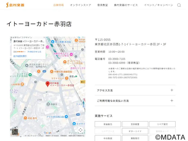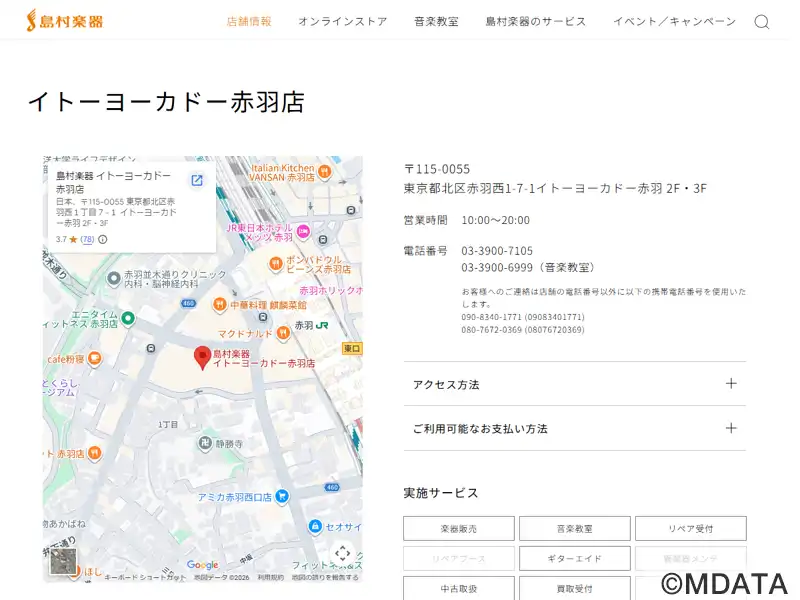 JR赤羽駅西口すぐのイトーヨーカドー赤羽店2F・3Fに2022年6月オープンした楽器店。前身のアピレ赤羽店(1995年10月〜22年5月)から移転リニューアル。3階にショップ、2階に音楽教室を運営。ギターやウクレレ、電子ピアノ、教育楽器、楽譜やアクセサリーの販売のほか、リペア受付と楽器買取受付サービスを行っている。2階の音楽教室では、幅広い世代が楽しめる多彩なレッスンと大人のための予約制サロンを開講。