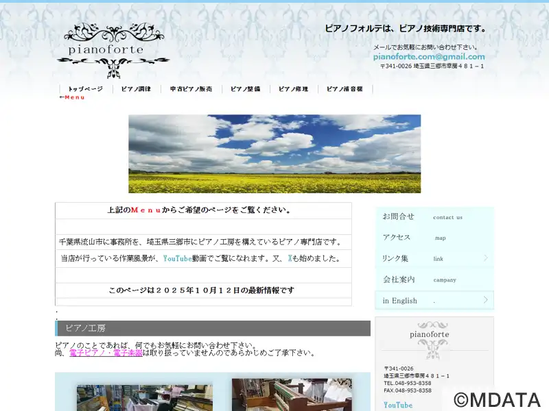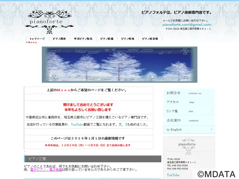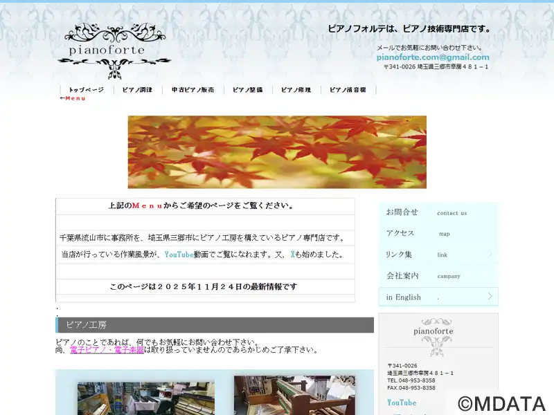 埼玉県三郷市にあるピアノ技術専門店。ピアノの調律、整備、修理を専門とし、長期間使用されていなかった楽器の再生や、引っ越し・リフォームに伴うメンテナンスにも対応している。ピアノの状態に応じて、クリーニングやタッチ・音色の調整、部分的な修理を行う。アコースティックピアノに特化し、利用者のニーズに応じた作業を提案。中古ピアノは一台一台丁寧に修理・調整を施し、音色やタッチに関する細かな要望にも対応している。