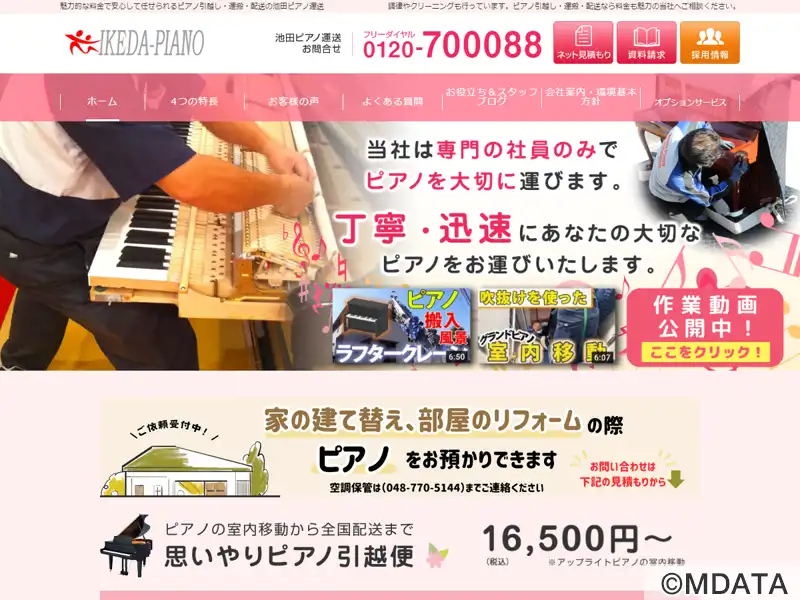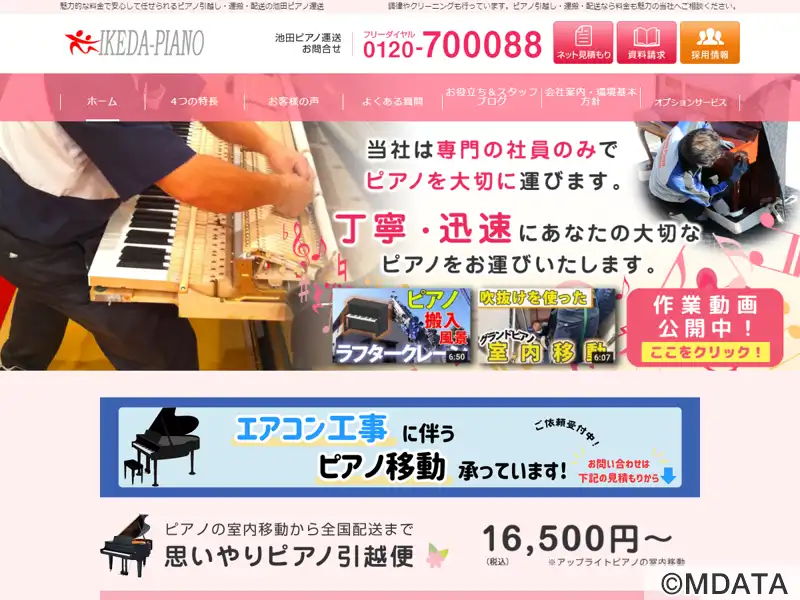横浜市を拠点にピアノを中心とした大型・精密荷物の運搬に特化した専門業者。楽器運搬のノウハウを蓄積し、室内移動から全国配送まで幅広く対応。専用車両と専門教育を受けたスタッフによる丁寧な作業を徹底し、調律やクリーニングなどの関連サービスも展開。ピアノだけでなく、精密機器やオーディオ機器などの輸送も可能。取引先は全国に約800社を数える。安全性と信頼性に加え、環境への配慮や社会貢献活動にも注力している。