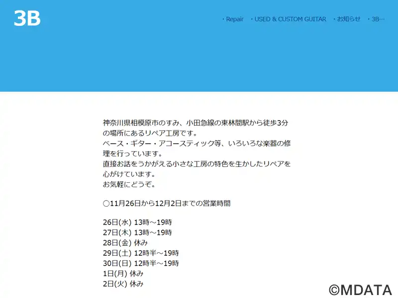 東林間駅西口のギター・ベース修理工房。2012年に淵野辺から移転リニューアルした3B(サンビー)は、小鳥たちと一緒にお花見するアットホームな修理屋さん。プレイヤーの音の好みにあわせたリペアときめ細やかな対応が評判で、人気のメンテナンスセット¥5,000とリーズナブルな価格設定。弾きやすく良い音が鳴るよう修理・調整済みの中古・カスタムギターも販売。インコ動画も要チェック。