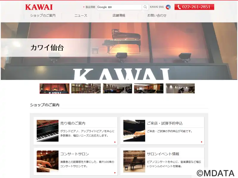 仙台市一番町四丁目商店街アーケードにあるカワイピアノ展示場。広々とした空間で、Shigeru Kawaiの特別仕様品、グランドピアノGXシリーズ、人気のアップライトピアノや電子ピアノを豊富に展示販売する。15,000冊の楽譜を取り揃え、1Fには防音室も完備。音楽教室も開講し、子どもから大人まで楽しめます。4Fには最大100席のコンサートサロン「Verde」があり、ミニコンサートや音楽講座が開催される。