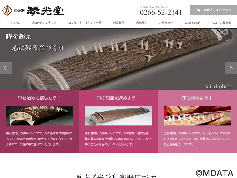 長野県諏訪市にある1880年創業の和楽器専門店。箏や三味線、尺八、太鼓、舞扇といった和楽器の販売や、中古楽器・付属品の取り扱い、糸締めや皮張りなどのメンテナンス、修理も行う。伝統技術に加え、楽器の改良や創作、技術研究にも注力し、時代に合わせた和楽器の提案を続けている。邦楽教室では、琴、地唄三絃、尺八、津軽三味線、長唄三味線など多彩なコースを開講。地域に根ざした音楽文化の継承と普及に努めている。