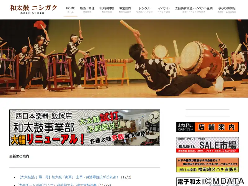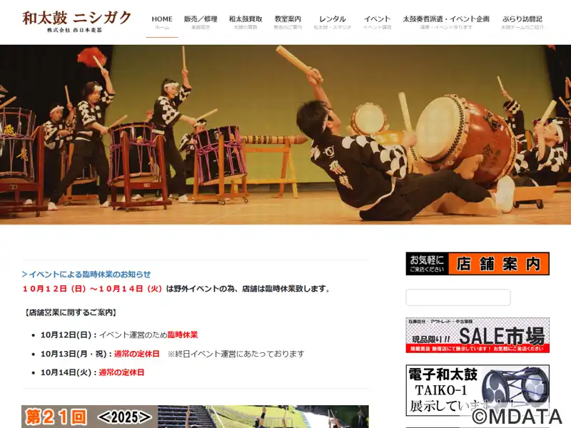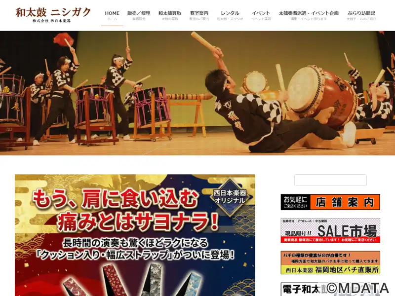 福岡県飯塚市に位置する和太鼓専門店。伝統的な長胴太鼓や締太鼓、携帯に便利な桶胴太鼓、電子和太鼓まで幅広い和太鼓を取り揃え、すべて職人の手作業による高品質な製品を提供。自社製バチも常時2,000組以上を在庫し、幅広いニーズに応えています。篠笛やチャッパ、ドラといった和楽器や、祭衣装のオーダーメイドにも対応。和太鼓や篠笛の教室も開催しており、初心者から経験者までが安心して学べる環境を提供している。