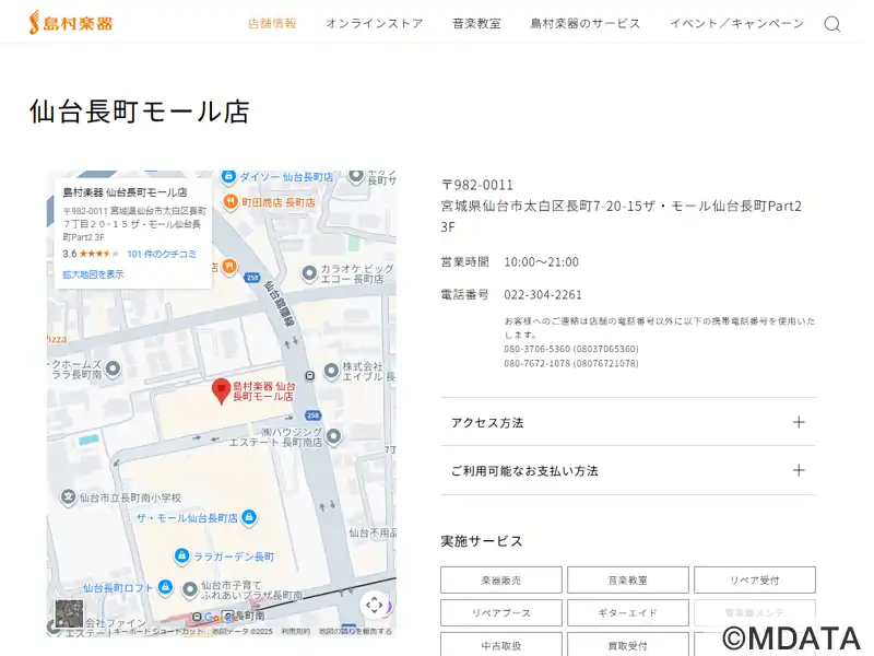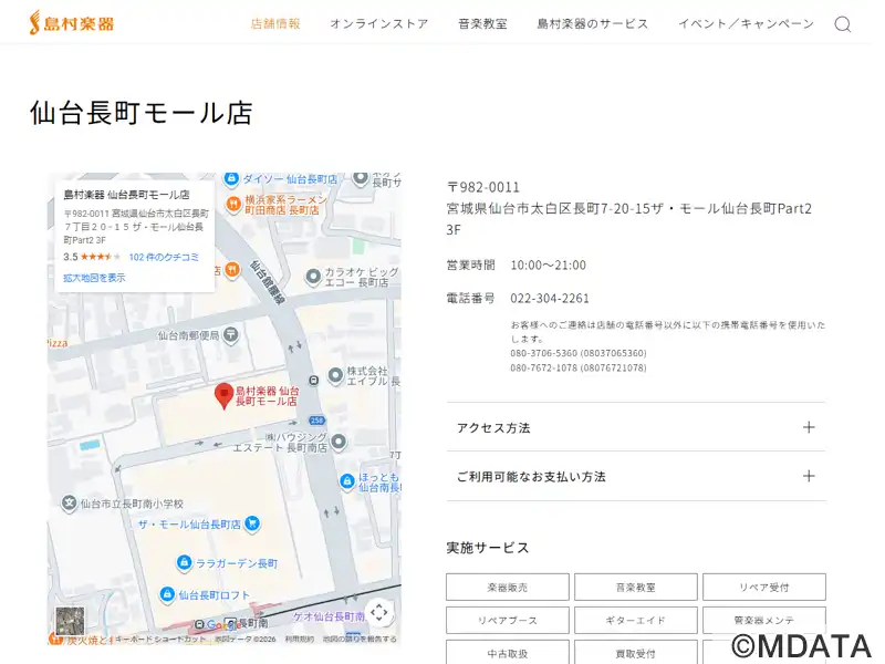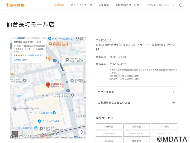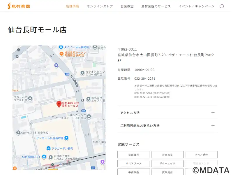ザ・モール仙台長町PART2 3Fにある総合楽器店。長町南駅から専用エスカレーターで直結。管楽器コーナーには、リペア技術者が常駐する管楽器リペアルームを完備。東北最大級の電子ピアノコーナー、国産・輸入エレキギターやアコースティックギター、ウクレレ、デジタル機材など幅広い品揃え。21年6月に増床リニューアルした音楽教室では約30種類のコースを開講し、レッスンルームやスタジオのレンタルも行っている。
