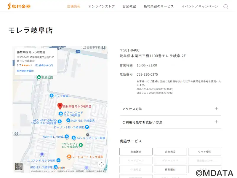 モレラ岐阜駅前のショッピングセンター「モレラ岐阜」2Fに2006年オープンした楽器店。ギターやウクレレ、管楽器、電子ピアノ、デジタル楽器など、さまざまなメーカーを品揃え。県内最大級のアコースティックギターコーナーは、エントリーモデルからハイエンドまで、ギター名産地の岐阜ならではの充実ラインナップ。店内に試奏ルームを完備し、ゆっくり楽器選びができる。音楽活動をサポートするをスタジオ、音楽教室を併設。