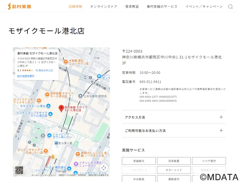 横浜市営地下鉄センター北駅前にある大観覧車が目印のショッピングセンター「モザイクモール港北」3階に2012年移転オープン。ギター、ピアノ、管楽器、デジタル機材など幅広い商品を取り揃えた総合楽器店。併設する音楽教室では曜日・時間固定制レッスンとピアノ・フルート・サックスの予約制サロンを開講。練習スタジオのほか、港北ニュータウンエリアの音楽仲間とつながり、演奏を楽しむサークルやイベントを主催している。